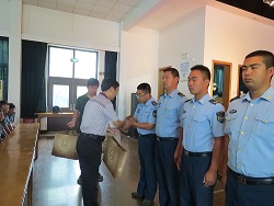 高康校长首先代表大众工业学校向浏河营地全体官兵几年来对我校的支持和关心表示诚挚的谢意,并送上高温防暑物资。高校长表示,营地官兵和军训基地领导克服重重困难,为我校军训提供了优越的训练条件和后勤保障,为大众师生能够顺利完成军事训练任务奠定了坚实基础;希望大众师生和部队、基地进一步加强合作,确保最终高质量地完成各项训练工作任务。