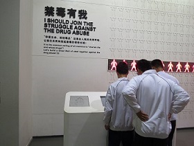 刚踏进参观的场馆便是一幕环绕身边的电影银幕,将思绪带回了那个深受鸦片危害的大清王朝,看到片中的人萎靡不振地端着一杆烟枪慵懒而无力地斜躺于暖炕之上,不由得生出一种痛心,也更明白了鸦片这些毒品危害的不仅仅是个人的身体和心灵的健康,更与民族存亡有着重要的联系。当在解说员的带领下看到了真正的毒品,那些经常在耳边响起的熟悉名字:海洛因、摇头丸、冰毒,如今以一种真实而不加修饰的方式出现在我们的眼前,隔着一层薄薄的塑料板,我们仿佛和毒品这头凶猛的野兽对面而立,距离不再遥远得不可估计。场馆的两壁上贴着许多吸毒者毒瘾发作时的画面,那一幕幕的癫狂撞墙和乱抓乱掐的触目惊心让唏嘘不已,而当看到那些吸毒所造成的身体的病变以及各种遗传危害时,不禁为那些吸毒导致的畸形胎儿和溃烂的身体感到深深的悲哀,多少人因为毒品走向了无尽的深渊。