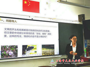 宋老师以“文章的情感和内容是否分离”这一问题引出本节课的教学重点——情景交融的写作手法。从“秋院图”的赏析开始,宋老师从精选色彩词、恰当运用修饰语、心理活动的词语以及动作行为这四个方面分析了“情”与“景”之间的关系,清晰透彻地讲授了情景交融的艺术表现手法。掌握了赏析方法后,同学们合作交流共同完成了其余四幅秋景图的赏析,并引导学生体悟到郁达夫笔下的“物哀之美”。