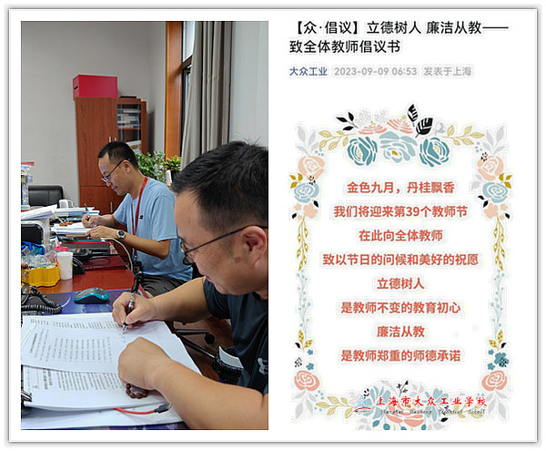 为进一步强化教师廉洁从教的思想意识,学校在“大众工业”微信公众号发布《【众·倡议】立德树人廉洁从教——致全体教师倡议书》,倡议共同做到“坚定正确方向,弘扬清风正气”“坚持廉洁从教,潜心教书育人”“坚守自尊自律,积极奉献社会”,以真心投身教育事业,以爱心经营教育事业,以衷心奉献教育事业,让清廉之风吹遍校园的每一个角落。