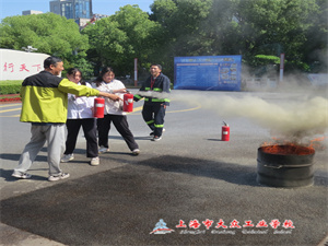 在消防灭火演练现场,李继先老师讲解了灭火器使用方法,并且现场示范,所有学生进行灭火演练,2人一组进行灭火,实地操作并规范使用灭火器。