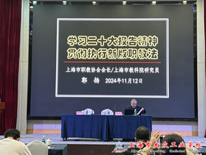 11月12日,会议继续深入进行。上海市职教协会会长、上海市教科院研究员郭扬,结合自身从事职教工作近四十年的实践和体会,就学习党的二十大报告精神及贯彻执行新职教法进行了深入解读。郭会长的讲座为与会人员提供了政策上的指导和支持,有助于各中职校更好地理解把握职业教育发展趋势。