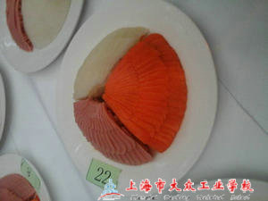 黄磊同学在此次比赛中第一个走出了考场,他所参与的项目为中餐冷拼和果蔬雕刻,月季花雕刻时间为5分钟,冷盘三拼为35分钟,他20多分钟就完成了作品,足见平时下了很大的工夫,一路的辛勤耕耘才有了今天的小小成绩。天道酬勤,黄磊是一个动手能力强、蛮能动脑的同学,所以老师一直很看好他,指导老师陈忠林老师说,他的领悟能力很强,也很善于思考,说了就能认真地做到。当然在这次比赛中他还是显示出“心慌紧张”这个薄弱之处。因此,要在下一阶段的训练中予以克服,不断提高技能水平。