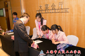 会议当天,每位参与的同学都在自己的岗位上认真履行着职责。负责签到的同学们仔细核对着每一个参会人员的名字,她们一开始还感觉有些拘谨,在陈亮老师和现场负责老师的细心指导下,她们慢慢进入了状态,对每位到场的嘉宾都会首先礼貌问好;贵宾室服务的同学们热情地引领到场的贵宾入座;分发资料的同学们也笑脸相迎地为每一位嘉宾分发资料;会场门口两位负责迎宾的同学,有礼貌地为每一位进出的嘉宾开门,并注意使门不发出一点噪音,以免影响论坛的进行……总之,每位参与的同学都做到了微笑相迎,礼貌服务。会议结束后,全体同学的工作态度得到了主办方的肯定与赞扬。