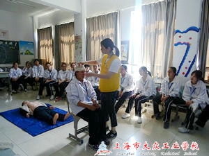 听完了理论知识,同学们就要上手操作了。同桌两人为一组,一人做病人,一人操作,相互配合。在开始演练之前,唐老师再次为大家亲自示范,而事实证明同学们实际操作时问题也还不少,几位老师都非常有耐心地在同学们操作过程中去帮忙反复纠正、提醒。