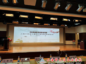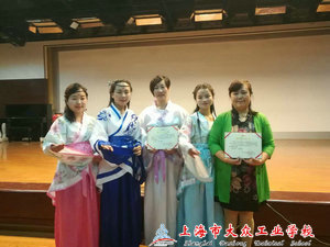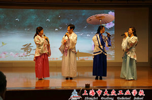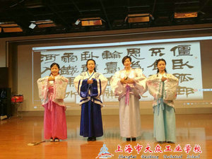 当天上午老师们抵达上海商学院之后,首先进行了节目彩排,下午一点半,展演活动正式开始。此次展演活动节目形式多样,既有独诵、集体朗诵也有师生同台演出。节目内容也十分丰富:既有热烈深情的爱国主义诗歌;也有婉转柔情的表达个人情怀的诗歌;还有古风古韵古味浓郁的古代诗歌。我校老师们展演的节目是《诗经》中的作品《蒹葭》,四位老师身着古代汉服,仪态端庄,朗诵入情,获得了台下老师们的热烈掌声。展演活动结束后,上海市教委教研室应宏芳老师上台发言并对为此次活动所付出的所有师生表示了感谢。活动最后举行了热烈的颁奖仪式。