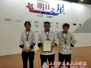 为搭建在校西餐专业青年厨师交流与学习的平台,通过实战演练,以促进教学与实操,产业与研究,院校及上下游产业链的协同交流与融合发展,激发广大青年厨师勤奋学习和自觉提高西餐烹饪技艺的热情,2018赛季Hotelex“明日之星”厨师大赛华东选拔赛区及全国总决赛于3月28--29日在上海新国际博览中心举行。我校烹饪专业由陆秋芳老师带队,秦秋华、杨广两位专业教师指导,王天浩,居仁滨,陈露三位同学组队参加了本次比赛的西餐项目。经过激烈角逐,我校参赛团队喜获优秀团体奖,其中陈露的甜品,王天浩的前菜获得银奖,居仁滨的热菜获得铜牌。