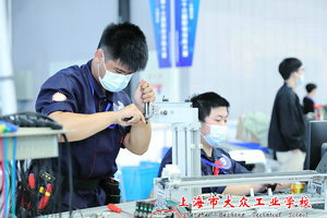 机电一体化赛项为团体赛,两人一组,需选手在4个小时内完成机械部件组装与设备安装、电路安装、气动系统安装并根据工作任务要求编写PLC控制程序与设置变频器参数、制作触摸屏页面、设置通信参数,最终实现对机电一体化设备的自动控制。比赛现场,我校6名学生争分夺秒,在规定的时间内进行了装配、编程以及调试的比拼。